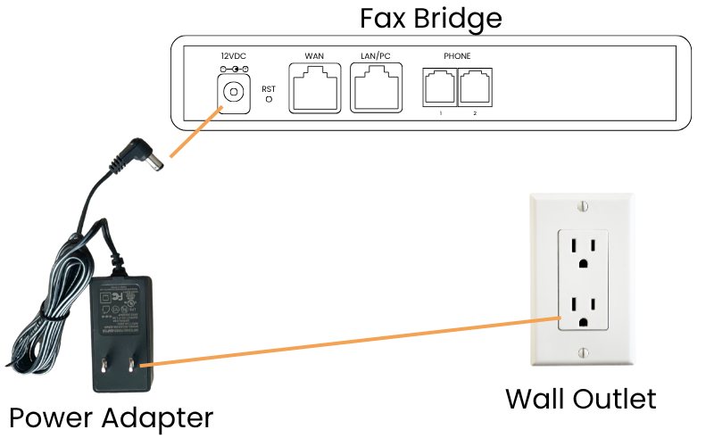 6. Now, find the new power adapter that came with your new fax bridge. Make sure you have the new power adapter before proceeding. Plug one end into the “12VDC” port on the new fax bridge. Plug the other end into a wall power outlet or power strip.
