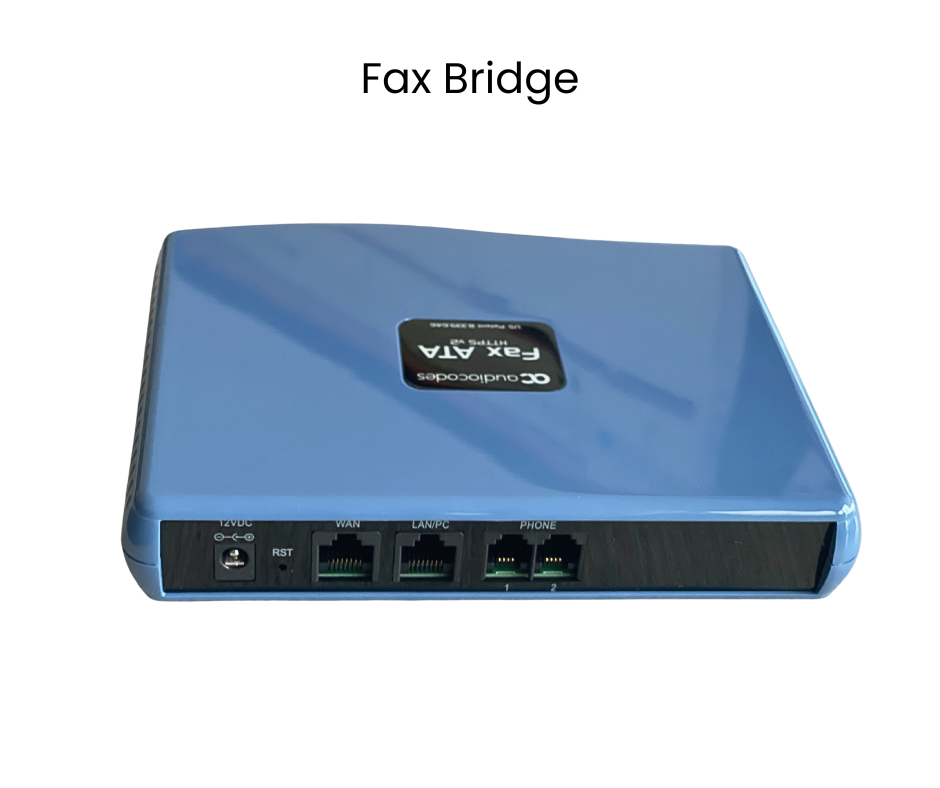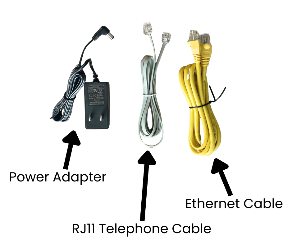 2. There will be 3 cords connected to the fax bridge: the power cord, the Ethernet cable, and the RJ11 telephone cable.