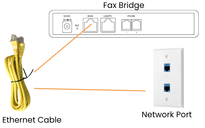 4. Find the ethernet cable. It will be plugged into the “WAN” port on the old fax bridge. Unplug the ethernet cable from the old fax bridge. (Do not unplug it from the network port or switch!) Take the end you just unplugged, and plug it into the “WAN” port on the new fax bridge.